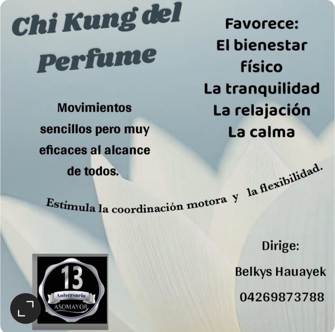 Te invitamos cordialmente para el día Jueves 23 de octubre de 2025 de 03:00 a 4:00 PM en la Sede de Asomayor al Conversatorio Gratuito de Chi Kung del Perfume donde te explicaremos todo lo que necesitas saber de esta maravillosa tecnica. Te esperamos, Asiste